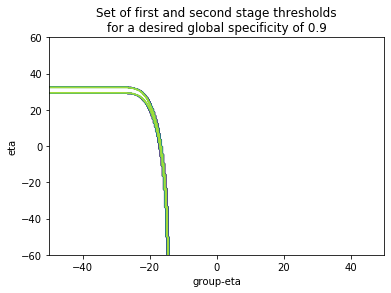 For now we don't yet have a simple criterion to select the thresholds $\bar{\eta}, \eta$. One approach would be to define a priori a specificity level we are comfortable with, say at $\pi_0'=0.95$, which defines a set $S\left(\pi_0'\right):=\left\{\bar{\eta}, \eta\right\}$ of first and second stage thresholds that correspond to that sensitivity, and find that set computationally: