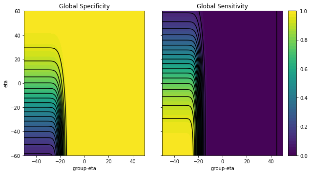 We are now ready to explore what the global sensitivity and specificity look like as a function of the group size and the test statistic thresholds $\eta$ and $\bar{\eta}$, for a model where $\mu_0 = -20$, $\mu_1 = 20$, $\sigma_q = 30$, $g=10$ and $p = 0.01$.